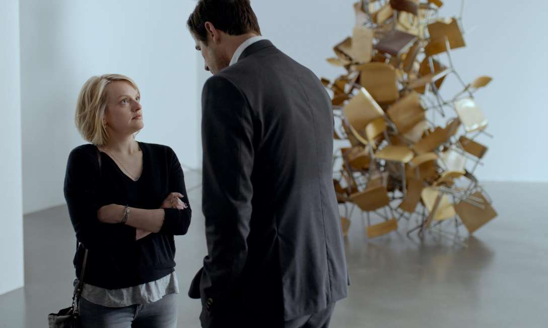 The initial scene sets the tone for the first half of the film. Christian is interviewed by journalist Anne, played magnificently by Elisabeth Moss (The Handmaid’s Tale, Top of the Lake, etc). After a coy, admiring question that massages Christian’s ego, she wrong-foots him by asking the meaning of the artist’s statement that describes one of his own exhibitions, some pretentious jargon-clothed gobbledygook about ‘museum’ and ‘non-museum’ that’s meant to sound cutting edge and profound but barely amounts to Duchamp’s ideas from a century ago (apparently the text was cribbed from a real artist’s academic statement). Christian’s discomfort is very funny when the bubble of his pretension is so easily burst.