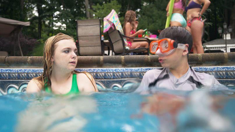 At other times, the film is more directly expressive. Kayla feels deeply insecure when she first arrives at a pool party that she doesn’t want to attend. She knows that she’s only been invited under duress by Kennedy the popular birthday-girl. At first, she’s frozen at the patio window, looking in terror at the popular, confident teens having fun in the pool. Then, having summoned up enough courage to go out, the camera follows Kayla closely behind as she walks from the house. We feel the terror in her every step, accompanied by a soundtrack reminiscent of a horror film score. In her green bathing suit, Fisher’s awkward stiff body language acutely expresses her self-consciousness. The walk seems to last forever, although the entire scene is probably less than a minute.