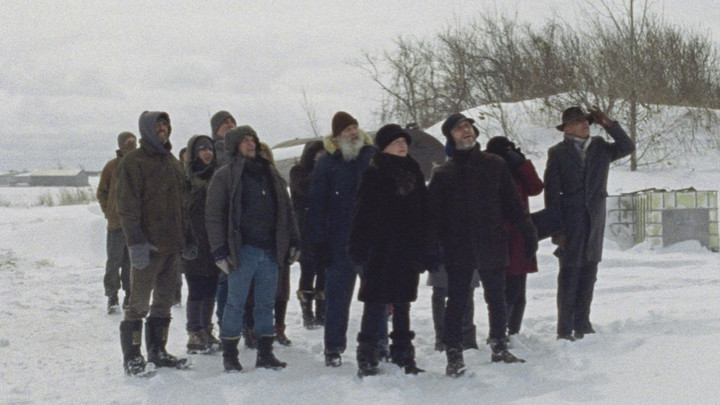 Shot in grainy 16mm, it has a palette of wintery skies, desaturated snow and pale faces wrapped on heavy dark coats to stave off the icy cold. Its tone is similarly icy and bleak.