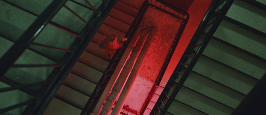 The film looks wonderful. The camera work is inventive, with some interesting compositions and great use of negative space. Colour is used strikingly. Now I admit I’m a sucker for the kind of bold, unnatural lighting seen in films by giallo directors Mario Bava or Dario Argento, but I really enjoyed the use of strong primary colours to light the sets. The main hallway and the hotel room were a sickly yellow, the bathroom a clinical white, and the stairs and corridors a blend of primary reds, greens and blues. I don’t think there was a particular meaning ascribed to the colours, but the lighting gave the film a visual beauty and an unsettling and heightened quality.